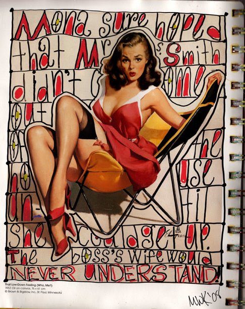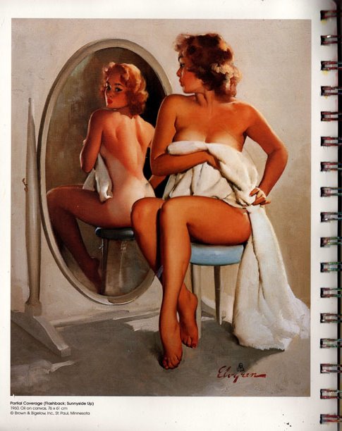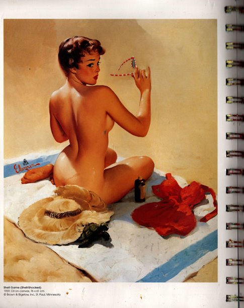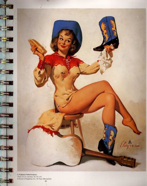 So this month, August, brought me a CJ with the theme of Pinups by Gil Elvgren. This guy did wonderful paintings of pinup girls. Why, I don't know. I can see that he was/is a talented artist, but I don't know much else about him, starting with whether he is still alive and when he created these paintings. I don't particularly care for his subject matter, but it isn't keeping me awake at night. I think it is passé. Not relevant to me or my time on earth. So what to do with these photos of paintings that I find slightly amusing, slightly distasteful in that they denigrate women and reduce them to sex objects. We do a much better job of it in the present. On the other hand, they recall a lighter period when a woman could be pretty and silly and even pretty silly and not worry about whether or not she was dragging the whole of her gender down in the doing of it!