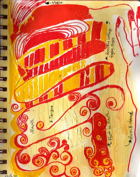 So here's what I've done with this month's challenge, the Pinups. Here's where I started. The idea popped into my head and had to be put down on paper. I couldn't wait long enough to even put some background color on the gesso! I picked up a gel pen, which others use a lot which is why I have them - bought on the recommendations of others and barely used, and got to work, working in someone else's style with no clear idea of where I was going!