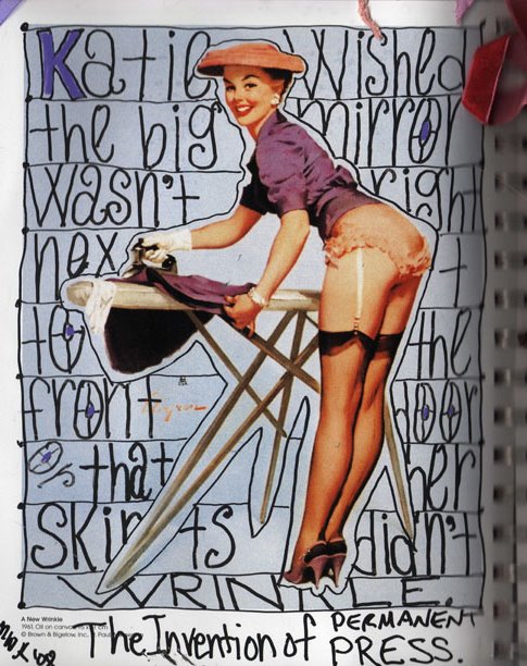 These paintings were done in a style that existed just to titillate men and this one objectified the woman more than any of the others, in my opinion. What woman would put her hat on and then press her skirt? Okay. I remembered a very well-dressed friend telling me that she liked to put on a bustier, thong, and 4-inch spike heels to run the vacuum cleaner. Hmmm... There plainly was nothing left to do but to make fun of the pinup. Before I knew it, Katie had invented permanent press!